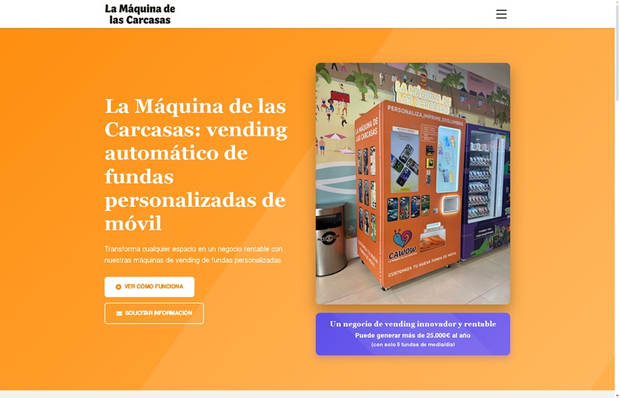 Nuevo concepto de vending para imprimir fundas personalizadas de móvil al instante. Un negocio rentable, innovador y fácil de gestionar. Compra, instala o solicita financiación. Un negocio de vending innovador y rentable, puede generar más de 25.000€ al año con solo 5 carcasas de media / día.