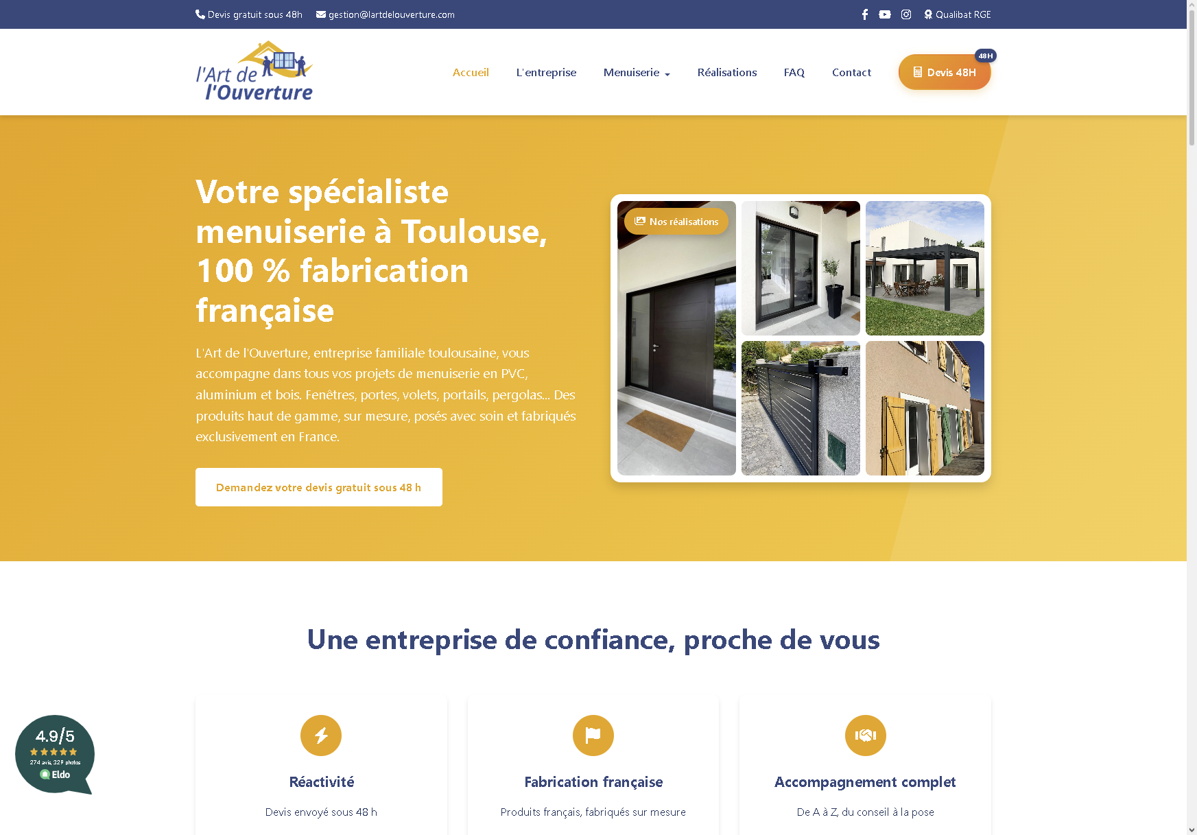 L'Art de l'Ouverture est une entreprise familiale de menuiserie établie à Castanet-Tolosan, au sud-est de Toulouse. Elle réalise la fourniture et la pose de fenêtres, portes d'entrée, volets, stores, portails, portes de garage, pergolas et carports en aluminium ou PVC, sur mesure et dans les règles de l'art. Certifiée Qualibat RGE, l'entreprise vous aide à mobiliser les aides disponibles pour financer vos travaux. Fabrication française, matériaux certifiés, pose garantie dix ans. Devis gratuit sous 48h sur simple demande, en ligne ou par téléphone.